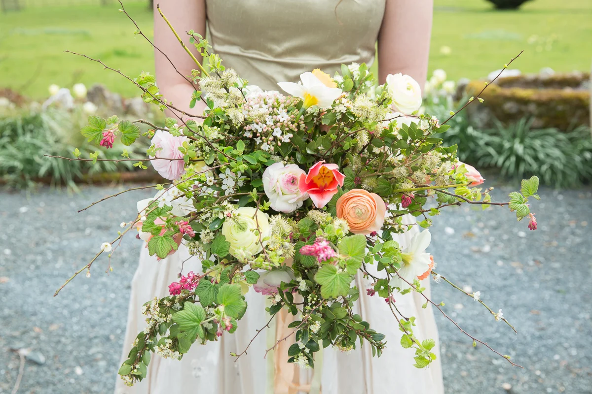 Bursts of vibrant, jubilant blooms were arranged by Vanessa at The Flower Mill Cornwall and the abundant foliage truly conveyed the sprightly, fresh energy of the season. Of course, daffodils had to show their smiley faces in this homage to botanical beauty and we adored their starring role in the statement headpiece, complete with twisted green twigs.