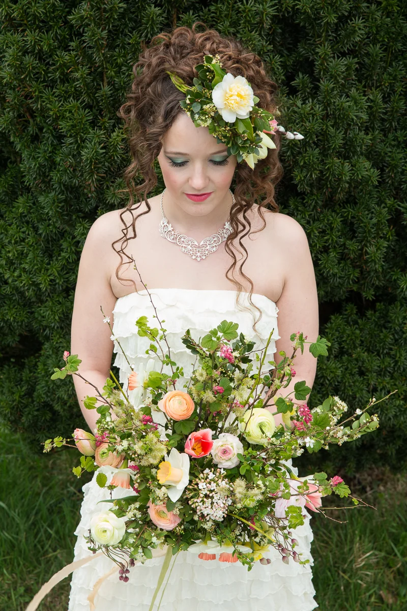 With a nod to A Midsummer Night's Dream, hair and make up by The Event Studios was kept softly romantic with highlights of green and pink. Christine Trewinnard designed the elegant gowns worn and we delighted in both the silky ruffles and the muted moss tones.